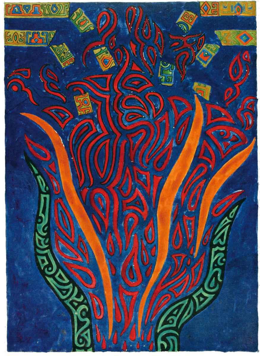 [11] 題字:“完成於1922年11月25日。火從穆斯皮利(Muspilli)中冒出來,竄到生命之樹上。一個循環已經完成,但這是在世界之蛋中的循環。一個奇怪的神,無名的孤獨之神,在蛋中孵化。煙和灰產生新的生物。”在挪威神話中,穆斯皮利(或穆斯貝爾海姆Muspelheim)是火神所在地。