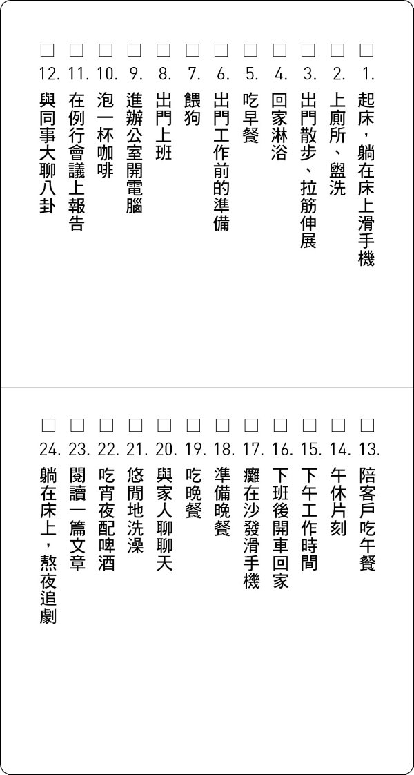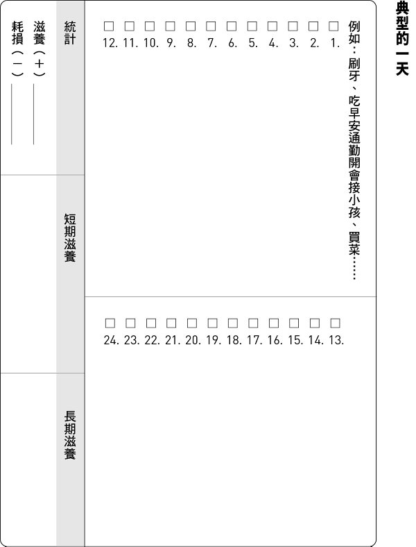 五、多多练习:我为各位准备了「典型的一天」空白表格(见下图),让你可以随心所欲地复印练习。多多练习几次,相信你可以凭自己的力量,找出帮助自己放松身心的正向因子。