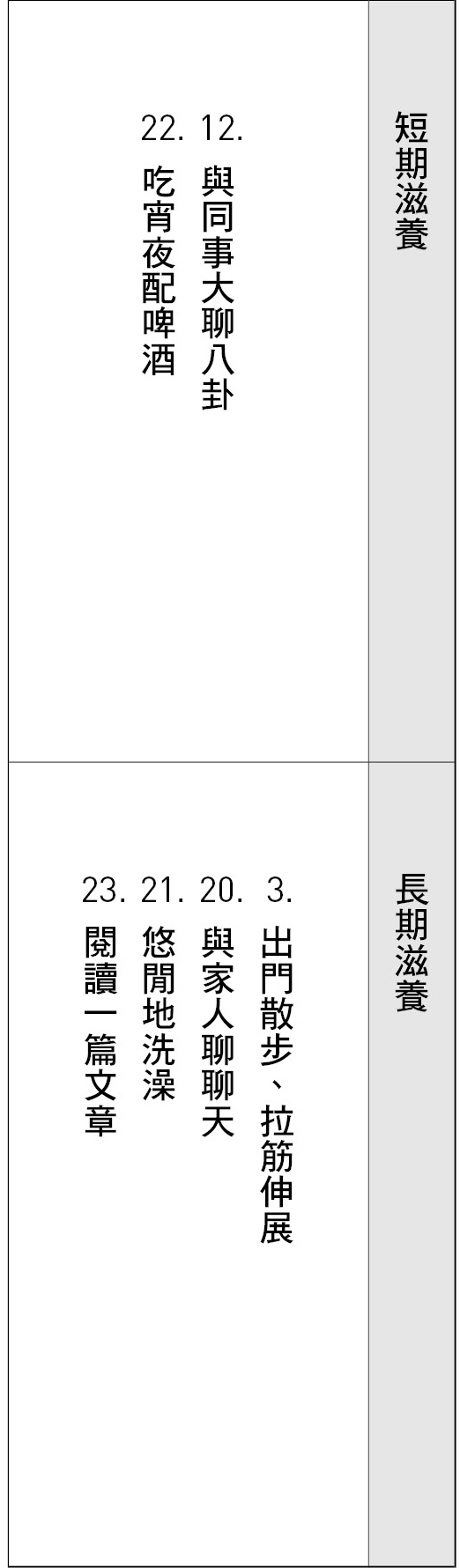 现在请你暂时放下「-」号,并且试着在「+」号当中,进一步辨识出哪些属于「短期滋养」?哪些能够带给你「长期滋养」?